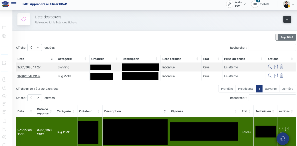 Afin de garantir une communication entre les intervenants (formateurs, secrétariat, élèves, tuteurs d’entreprise), ARES propose une plateforme ENT “PPAP”. Sur cette plateforme se retrouvent des tickets, pour faciliter la communication mais aussi plannings, évènements, informations relatives à l’élève pour les tuteurs (évaluations, bulletins, absences, suivis). Le but est de synchroniser et d’uniformiser les contacts.