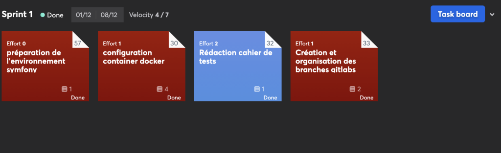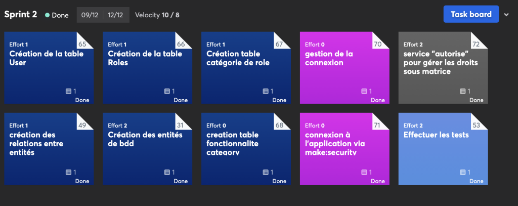 Par exemple : la création d’une entité (sans relation) serait d’un effort zéro puisqu’elle est automatique sur Symfony et ne demande pas un nombre immense de tests. Tandis que la création du CRUD qui s’ensuit peut-être d’un effort 1 ou 3 suivant le besoin fonctionnel (quels utilisateurs ont accès à ce crud, a-t-on une dépendance avec une autre entité ? etc.)